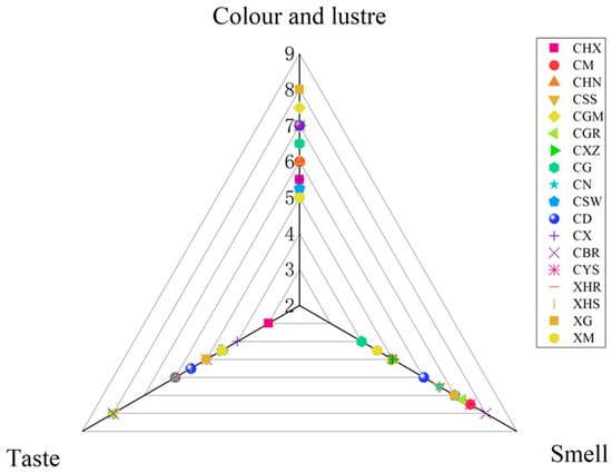 Sensory evaluation can analyze subtle differences that cannot be detected by instruments, which can be described with a series of sensory descriptors [12]. The commonly used instrumental analysis techniques for the identification of volatile components in food include the electronic nose, gas chromatography–mass spectrometry (GC–MS), and gas chromatography–odor–mass spectrometry [13]. In recent years, gas chromatography–time-of-flight mass spectrometry (GC–TOF MS) has been increasingly used in the detection of volatile components in food, and compared with GC–MS, GC–TOF MS can detect more subtle differences [14]. GC–TOF MS is superior to ordinary MS in terms of resolution, mass accuracy, sensitivity, scanning speed, and detection limit [15].