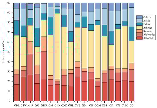 As shown in the figure, there were significant differences in the contents of aldehydes, alkenes, and esters among the 18 dry chili peppers, and the contents of aldehydes in XHR (21.50%) and XHS (28.33%) were greater than those in the other varieties. The contents of alkenes in CHN (64.35%) and CGM (53.97%) were greater than those in the other chili peppers, and the contents of esters in CBR (14.60%), XG (19.10%) and CM (17.81%) were greater than those in the other chili peppers. In most dry chili peppers, the content of alkenes is significantly higher than that of other ingredients. Previous studies have shown that different varieties of chili pepper retain certain key complex aromas after drying; in this study, the complex aromas of different varieties differed, which is consistent with the literature [21].