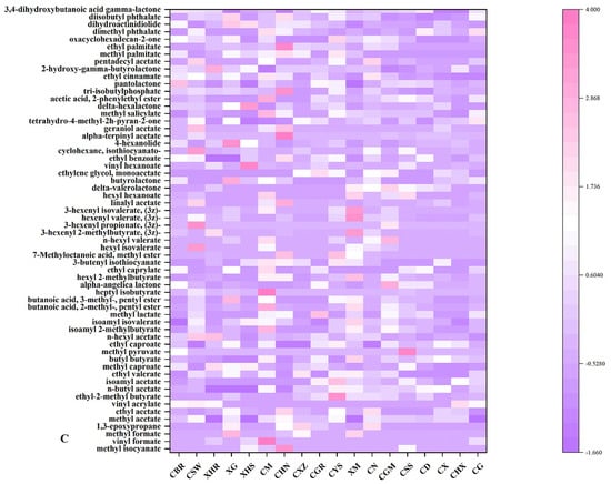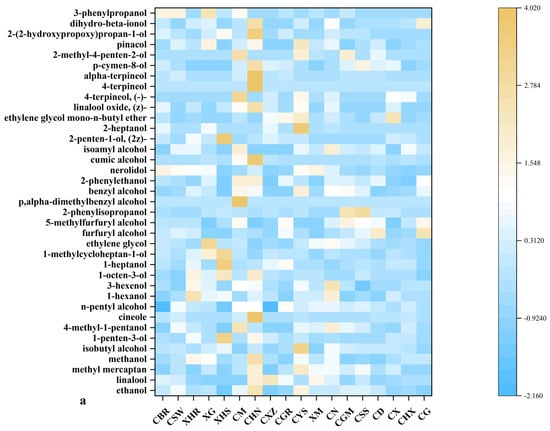 Heatmap cluster analysis of alcohols in the volatile organic compounds of dried chili pepper was performed (Figure 3a). Alcohols are classified into saturated alcohols, unsaturated alcohols, and cyclic alcohols, of which saturated alcohols have a higher threshold of detection and are not easily detected [22]. The ethanol peak areas of CHN (5240.12), CYS (4651.96), and CSW (4097.41) were significantly higher than those of the other dry chili peppers, and CXZ (2844.68) had the lowest ethanol peak area. Linalool, the second most prevalent alcohol identified, is an aromatic monoterpene alcohol widely present in essential oils [23]. CXZ (4005.35), CHN (3577.81), and XM (2947.18) had the largest peak areas for linalool, and CGM (43) had the smallest peak area. 4-methyl-1-pentanol is the third largest alcohol substance, and the peak area content of CM (1414.34), CN (1173.64), and CSW (810.89) is significantly higher than that of other dried chili peppers; the volatile compound was also detected in the peel of Zi Yang tangerine [24]. n-Butyl alcohol is often used as a reference gas for complex gas mixtures [25]. Nerolidol, which can provide floral and fresh fruit aromas [23], was detected in all the samples, and the peak areas of XM (62.14) and CBR (61.45) were significantly higher than those of the other samples, consistent with the sensory score of 3.1.