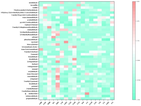 Heatmap clustering analysis was performed for aldehydes in the volatile organic compounds of dried chili pepper (Figure 3b). The low aldehyde threshold plays a very important role in providing the characteristic smell of dried chili pepper. Isobutyraldehyde was the main volatile aldehyde; its peak areas in CYS (795.77), XR (781.70), and CM (713.02) were significantly greater than those in the other dried chili peppers, whereas the peak area of XG (89.37) was the lowest. 3-Methylbutanal was the second most prevalent volatile aldehyde, and its peak area in XHS (553.21) was significantly higher than that of the other dry chili pepper samples; the samples with the next highest peak areas were CG (388.37) and XHR (365.26), and CHN (68.12) had the lowest peak area. Propionaldehyde was the third most prevalent volatile aldehyde; CYS (740.67) had the largest peak area, followed by CHN (642.29) and XHR (442.53), but no propionaldehyde was detected in CSW, CXZ, XM, CN, CSS or CD. Furfural has a burnt and malty taste and is one of the main flavor substances in malt [26]. Among the tested chili pepper varieties, higher peak areas for this compound were detected for CGR (217.03) and CG (215.60). 2,4-Heptadienal is a volatile aldehyde with a high content in chili oil and can provide a grassy and fruity flavor [27]. In this study, the peak area of 2,4-heptadienal in XHS (147.02) was high, but this compound was not the main volatile aldehyde, possibly because the bio-oil used in the production of chili oil is not affected by temperature and contains mainly aldehydes and ketones [28]. trans-2-Pentenal, 1,3,4-trimethyl-3-cyclohexen-1-carboxaldehyde, and 3,3-diethoxypropyne were detected only in a few samples and had a small peak area.