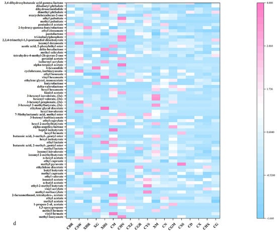 Volatile organic compound heat maps of different dried chili powders: (a) volatile alcohol heat map of dried chili powder; (b) volatile aldehyde heat map of dried chili powder; (c) volatile hydrocarbon heat map of dried chili powder; (d) volatile ester heat map of dried chili powder.