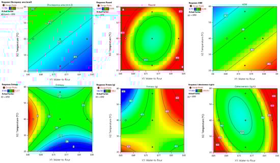 Among the parameters studied, area discrepancy, round, ASM, entropy, firmness, and cohesiveness produced satisfactory predictive models (R2 > 0.70) concerning the combined influence of the water-to-flour ratio, temperature, and printing speed (Table 5, Figure 2).