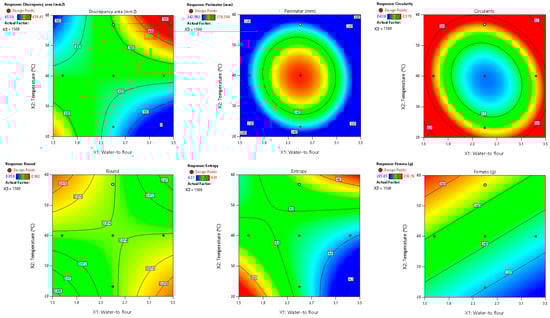 Among the evaluated parameters, area discrepancy, perimeter, circularity, round, entropy, and firmness produced satisfactory predictive models (R2 > 0.70) regarding the combined influence of water-to-flour ratio, temperature, and printing speed (Table 8, Figure 3). These models also passed the lack-of-fit test (p > 0.05), confirming their adequacy in representing the experimental data and minimizing unexplained variability. Additionally, normal probability and residual vs. predicted plots (provided in the Supplementary Materials) confirmed the normality and homogeneity of variance, further supporting the reliability of these models. As in the RFB design, the water-to-flour ratio and temperature had the greatest impact, as evidenced by their highest coefficients in the mathematical models.