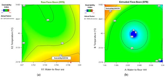 Regarding instrumental texture profile, the firmest and most cohesive samples were obtained using water-to-flour ratios below 0.67 and temperatures below 30 °C, as well as ratios above 0.75 and temperatures above 40 °C. This dual behavior could be attributed to the protein and carbohydrate content of fava bean flour. At lower water-to-flour ratios and temperatures, a denser matrix may form, resulting in a harder product. Conversely, at higher water ratios and slightly higher temperatures, proteins and starches achieve a degree of swelling and cross-linking that enhances cohesion and resistance to deformation [67,72].