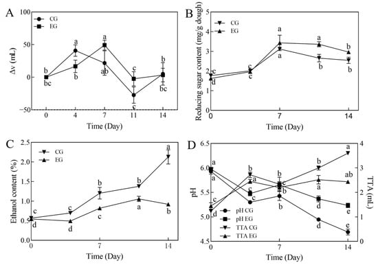 Moreover, the EG increases and decreases, finally converging to zero from EG0 to EG14. CG4 and EG7 are the Δv maxima for the CG and EG, respectively (Figure 2A). The results showed that the addition of a combination of non-Saccharomyces Yeasts with a low acid- and alcohol-producing capacity (Metschnikowia pulcherrima and Wickerhamomyces anomalus) and S. cerevisiae controlled the leavening power of the dough during long-term refrigeration, de-escalating the over-fermentation of the dough compared to S. cerevisiae.