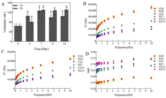 Changes in gas-holding capacity (A) and rheological properties (G’ (B), G” (C), tanδ (D)) of long-term refrigerated fermented doughs. Different letters (a–c) indicate statistically significant differences between groups at the same time point. The same letter indicates no significant difference and different letters indicate a significant difference. The error line at the top of each column in Figure 3A refers to the standard deviation.