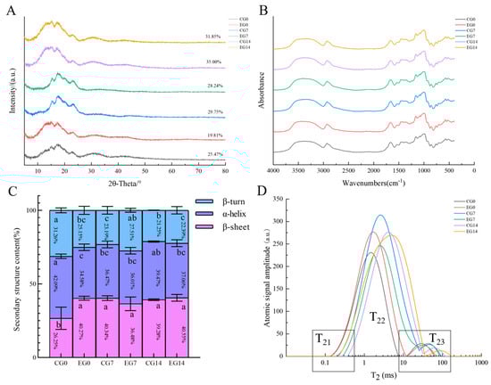 Changes in XRD (A), FT-IR (B), secondary structure content (C), and T2 relaxation time (D) of long-term refrigerated fermented doughs. The numbers on the curves in (A) indicate the crystallinity of the starch for which they are used. Different letters (a–c) indicate statistically significant differences between groups at the same time point. The same letter indicates no significant difference and different letters indicate a significant difference. The error line at the top of each column in Figure 4A refers to the standard deviation.