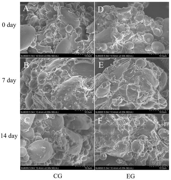 Changes in SEM (×3000) of long-term refrigerated fermented doughs. (A) CG0; (B) CG7; (C) CG14; (D) EG0; (E) EG7; (F) EG14.
