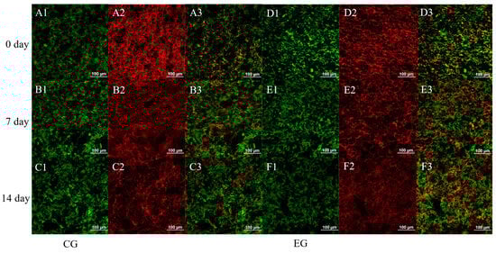 The SEM microstructural changes in the refrigerated dough are shown in Figure 5. The dough is a complex mixture in which the gluten forms a continuous three-dimensional network structure that encases the starch granules [51]. The voids in the microstructure are due to gaseous carbon dioxide produced by the yeast. CG0 and EG0 starch-sized granules were uniformly distributed in the gluten network structure (Figure 5A,D). This shows that all groups of doughs had a uniform distribution of starch and gluten structure on day 0 [52]. CG7 starch granules gradually aggregated and encapsulated within the gluten protein structure, and the CG14 gluten network structure loosened and receded, accompanied by exposed starch granules (Figure 5B,C). The EG7 and EG14 starch granules remained encapsulated with the gluten proteins and maintained a better state (Figure 5E,F). As seen in Figure 6, at specific excitation wavelengths, the gluten network structure and starch granules bound to rhodamine B and fluorescein isothiocyanate (FITC) dyes, respectively, each showing red and green colors, and the two macromolecules cross-linked to yellow [53]. As seen from CG0 to CG14, the red color in the field of view diminishes, and the yellow color becomes less, indicating a reduced dough protein structure and a weaker cross-link between the starch and proteins in the control group (Figure 6A–C). The dough gap increased in the experimental group, and the starch and protein structures were stably cross-linked and uniformly distributed (with yellow cross-link) from EG0 to EG14 (Figure 6D–F). This was because the metabolites of S. cerevisiae in the CG led to the hydrolysis of the gluten protein structure, and the aggregation of starch de-exacerbated the flaccidity of the gluten structure in the dough [14]. Incorporating M. pulcherrima and W. anomalus reduced the damage caused to starch and protein by yeast metabolites, and DATEM facilitated the interaction between starch and gluten network protein structures (with yellow cross-links). Therefore, mixed yeast strains and additives facilitated the interaction between starch and the gluten protein network structure, enhancing the protein gluten network structure and prolonging the long-term refrigeration period of the dough.