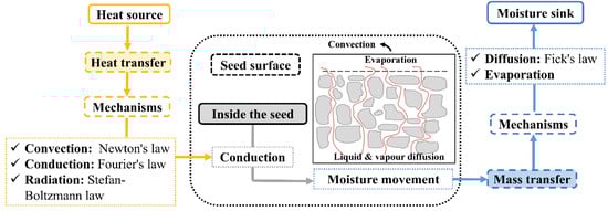 Convection occurs due to a difference in temperature between the airflow and the inside of the seed. The airflow moves over the seed surface (the testa is the seed coat) or the surrounding area. The outflow of water from the inside of the seed is caused by a moisture differential between the inside of the seed and the air. The physical law that explains the heat transfer by convection (Qconv) is Newton’s cooling law [].