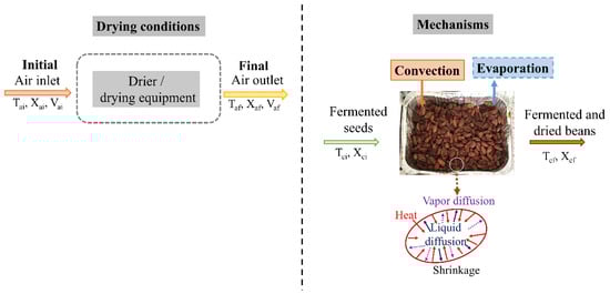 In cocoa transformation from seeds to beans, fermentation is considered the core and most studied stage. However, the quality of cocoa is the result of the sum of genetics and agroecological factors and the influence of processing operations, especially drying. Cocoa drying consists of a thermophysical and biochemical process that occurs in the fermented seeds to remove moisture, to prevent spoilage by microorganisms, and to facilitate the development of chemical reactions to favor the sensory quality of the derived products. As can be seen in Figure 1, cocoa drying involves two transfer phenomena: heat and mass transfer that involve mechanisms and physics laws [].