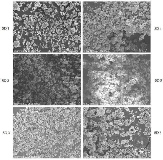 The SEM analysis of the powders SD 1 to SD 6 shows a close correlation with their particle size distribution data, highlighting the differences between samples (Figure 1). SD 1, which has the smallest particle size (1.73 ± 1.27 μm), exhibits relatively fine particles in the micrographs. These particles appear more variable in size, consistent with the high standard deviation observed in their particle size distribution, suggesting a less uniform formation during spray drying.