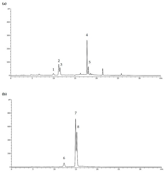 HPLC chromatograms of phenolic compounds from BRP extracts, detected at (a) 350 nm for 1—chlorogenic acid, 2—kaempferol derivate 1, 3—kaempferol derivate 2, 4—rutin, 5—isoquercitrin, and (b) 520 nm for 6—cyanidin 3-O-galactoside, 7—cyanidin 3-O-sambubioside, 8—cyanidin 3-O-glucoside.