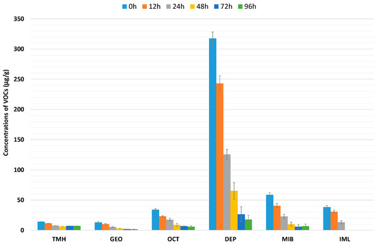 Figure 2 shows the main VOCs associated with off-flavor aromas, namely 3,5,5-trimethyl-1-hexene (TMH), dimethyl-8-hydronaphtalen (GEO), 1-octen-3-ol (OCT), diethyl phthalate (DEP), 2-methylisoborneol (MIB), and α-isomethylionone (IML).
