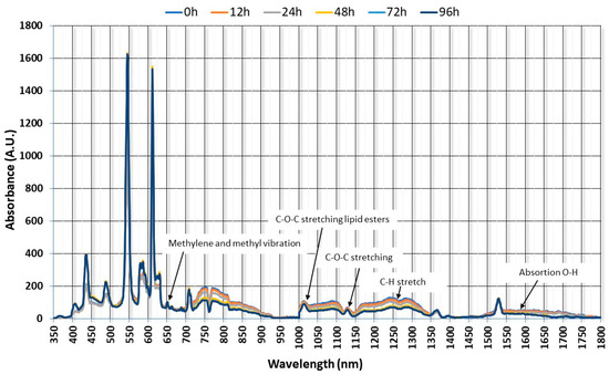 Figure 3 shows three key regions where differences between spectra occurred with the washing time, classified as 400–650 nm, 700–900 nm, and 1000–1350 nm, respectively. Absorbance was lowered as the washing time increased. It is in these regions that the absorption bands of the characteristic families of VOCs included in Figure 2 produced significant differences in the absorption intensity.