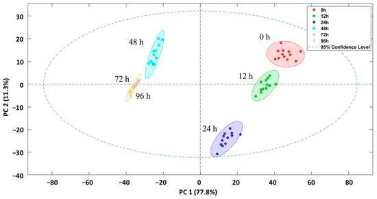 Principal component analysis of fish samples after application of different clean water depuration processes at 0 h, 12 h, 24 h, 48 h, 72 h, and 96 h.