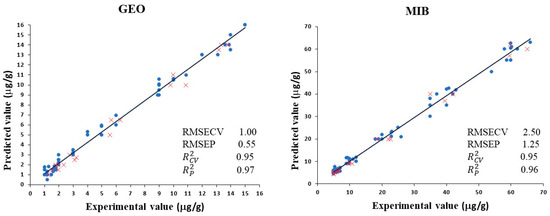 PLS cross-validation predictions (●) and validation set predictions (x) for GEO: dimethyl-8-hydronaphtalen and MIB: 2-methylisoborneol quantified (μg/g) and their correlations with NIRS data.