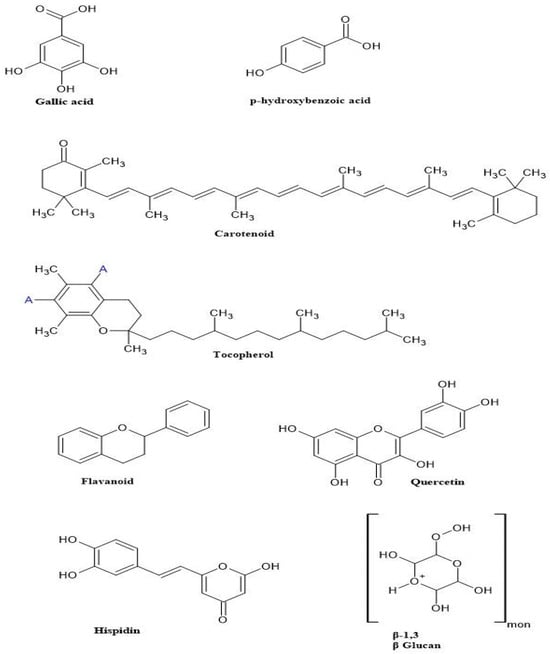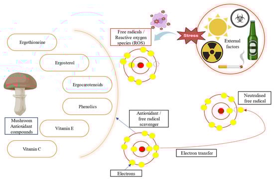 Oxidative stress can damage DNA, protein, and cell membranes, which eventually leads to various major diseases such as tumors, diabetes, neurodegenerative diseases, and kidney disease [129]. Polysaccharopeptides found in mushrooms can improve overall fitness by triggering enzymes that remove free radicals and reduce oxidative stress [87]. Mushrooms contain a variety of antioxidant compounds including ergothioneine, ergosterol, carotenoids, phenolics, tocopherols (vitamin E), ascorbic acid (vitamin C), polysaccharides (acidic polysaccharides), and amino acids [hydrophobic amino acids (HAAs) like leucine, isoleucine, valine methionine, proline, alanine, etc.] [123,130,131]. For example, P. ostreatus extract has been demonstrated to increase catalase gene expression and diminish free radical-induced protein oxidation in adult rats, protecting against age-related illnesses. The ethanolic extract of dietary P. ostreatus mushrooms inhibits lipid peroxidation, chelates ferrous ions, reduces ferric ions, and quenches 2,3-diazabicyclo. Another study attributed the superior antioxidant properties of P. ostreatus to its carbohydrate component—specifically, β-glucan—which may be responsible for its efficacy [24,132,133]. Furthermore, P. ostreatus mushrooms provide a wealth of antioxidants in food sectors, particularly as food additives [134]. An antioxidant assay determined the free radical scavenging activity of A. bisporus polysaccharide extracts. At 250 μg/mL, the extract displayed an 86.1% free radical scavenging activity, which was substantially greater (p < 0.01) than BHT (83%) [29]. As a result, mushroom consumption may enhance an individual’s antioxidative capacity, thereby reducing oxidative stress in the body [119]. The stabilizing of free radicals is shown in Figure 4.