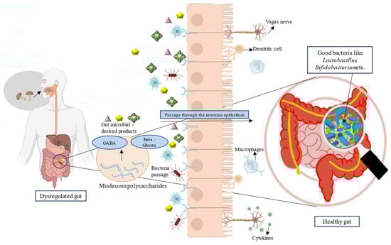 Prebiotics are “a substrate that is selectively utilized by host microorganisms conferring a health benefit” [119]. Mushrooms are valuable sources of prebiotics including polyphenols, oligosaccharides, and fibers, which enhance the metabolic activity of beneficial members of gut microflora [117]. A mushroom G. lucidum contains polysaccharides and peptides that are non-digestible by pathogens, preventing their multiplication and thereby altering the gut microbiota [11,113]. These indigestible polysaccharides derived from mushrooms serve a prebiotic role, suppressing the proliferation of pathogenic bacteria within the gastrointestinal tract while enhancing the growth of beneficial probiotic bacteria. G. lucidum, H. erinaceus, L. edodes, and G. frondose are among the most frequently reported edible mushrooms known to modulate gut flora [119,120]. β-glucan, a type of polysaccharide found in mushrooms, can be fermented by gut bacteria, leading to beneficial changes in the host’s microbiome [49]. The diagrammatic representation of how a mushroom-based diet enhances gut microflora is depicted in Figure 2.