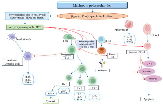 Cancer is a fatal disease causing over 10 million deaths yearly according to the World Health Organization (WHO). Research has demonstrated that polysaccharides derived from mushrooms can inhibit tumor progression by enhancing the immune response, particularly through their impact on natural killer (NK) cells and macrophages via T-cell activation and cytokine secretion [121]. Polysaccharides from mushrooms can impede tumor progression by augmenting the immune response through their influence on natural killer cells and macrophages mediated by T-cell activation and cytokine secretion [122,123,124]. Notably, nearly 200 species of edible mushrooms demonstrated the capacity to reduce the growth of various cancer cells [125]. Specific compounds found in different mushroom species have been identified for their antitumor properties. For instance, A. bisporus contains quinone 490 and 1-oleoyl-2-linoleoyl-3-palmitoyl glycerol, and ganoderiol F and ganodermanontriol in G. lucidum and galactoxyloglucan in H. erinaceous have shown potential in combating cancer [68]. Mushrooms are rich in various anticancer components such as antroquinonol, krestin, cordycepin, lectin, sulfated polysaccharide hispolon, lentinan, and maitake D fraction [121,126]. The polysaccharide β-glucan is acknowledged for its role in augmenting immune functionality through the stimulation of cytokine synthesis, which subsequently triggers the activation of both phagocytes and leukocytes [80,127]. L. edodes contains lentinan and lectins, which demonstrated cytotoxic effects on breast cancer cells [128]. Studies indicate that hispolon, an active polyphenol compound, demonstrates potent antineoplastic effects through multiple mechanisms, including the upregulation of death receptors and downregulation of antiapoptotic proteins like c-FLIP, Bcl-2, and Bcl-xL. Furthermore, hispolon enhances the effectiveness of chemotherapeutic agents, making it a promising candidate for cancer therapy [129]. Furthermore, G. lucidum contains certain polysaccharides that are beneficial for mitigating colorectal cancer symptoms as they reduce the expression of rectal cancer-related genes. These polysaccharides also demonstrate cancer-preventive and therapeutic actions by dynamically controlling the gut microbiota and host immune responses. G. lucidum polysaccharides can modulate the immune system by activating and expressing cytokines related to inflammation (e.g., interleukin-1, interleukin-6, and tumor necrosis factor-α) and antitumor activity (e.g., interferon-γ and tumor necrosis factor-α). A contemporary in vivo study underscored that a newly identified acid-soluble polysaccharide extracted from G. frondosa exhibited protective effects on the thymic and splenic tissues of mice with tumors, concurrently inhibiting the proliferation of H22 solid tumors. These bioactive compounds markedly enhanced the functional activities of natural killer (NK) cells, macrophages, CD19+ B cells, and CD4+ T cells, ultimately facilitating apoptosis of H22 cells through the induction of G0/G1-phase cell cycle arrest [123]. A diagrammatic representation of the mushroom polysaccharides working as anticancer agents is presented in Figure 3.