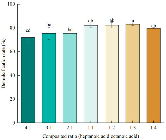 The effect of the composite ratio of heptanoic acid to octanoic acid on the demulsification rate. A significant difference between samples is indicated by different lowercase letters (p < 0.05).