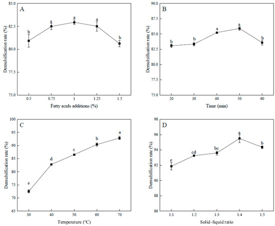 Effect of different conditions on demulsification rates of peanut emulsion. (A) The addition of composite fatty acids, (B) reaction time, (C) reaction temperature, and (D) solid–liquid ratio. A significant difference between samples is indicated by different lowercase letters (p < 0.05).