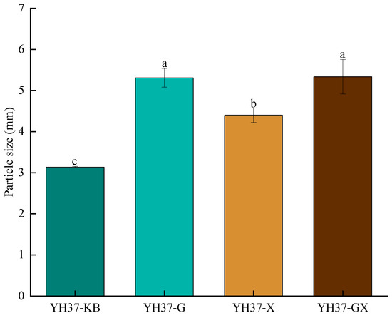 Particle size and potential are important parameters for assessing the stability of peanut emulsions [30,31,32]. The smaller the particle size, the more stable the emulsion [33]. The effects of adding different fatty acids on different size particles of the emulsions are shown in Figure 3. Compared to the original emulsions, all three samples with added fatty acids presented an increase in particle size. This finding was consistent with the results reported by Zheng et al. [34], who reported that adding medium-chain fatty acids increases the particle size of emulsions. The particle size of YH37-G was greater than that of YH23-X, whereas the particle size of YH37-GX was greater than those of YH37-KB and YH37-X. Fatty acids could intensify the Brownian motion between emulsions, decrease the electrostatic repulsion between droplets adsorbed by protein particles, and increase the propensity for droplet instability. This leads to the aggregation of droplets, an increase in droplet volume, and an increase in the particle size of the emulsion [35,36]. Compared to octanoic acid, composite fatty acids and heptanoic acid exhibited the most effective demulsification properties.