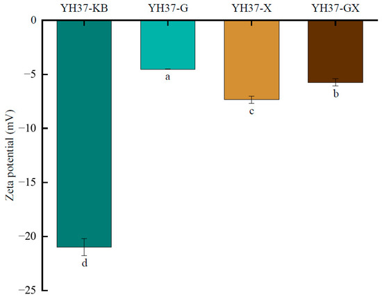 The absolute zeta potential can effectively reflect the electrostatic interaction between fat globules. A larger zeta potential indicates a greater net surface charge, which results in an increase in electrostatic repulsion between fat globules. This reduces the probability of water precipitation and agglomeration, thus enhancing the stability of the emulsion system [30,31]. The effect of distinct fatty acid additions on the emulsion potential is illustrated in Figure 4. As illustrated in the figure, the absolute zeta potentials of the samples demulsified with the addition of fatty acids were lower than those of the original peanut emulsion. The absolute zeta potentials could be arranged in ascending order as follows: YH37-G, YH37-GX, YH37-X, and YH37-KB. This finding indicated that the addition of fatty acids caused the peanut emulsion to deviate from its original pI, reducing the electrostatic repulsion between oil droplets and causing oil droplet aggregation in the emulsion. On the other hand, it was possible that heptanoic acid could more effectively change the pH of the emulsion than octanoic acid. Meanwhile, the increase in temperature during demulsification might lead to a change in zeta potential.
