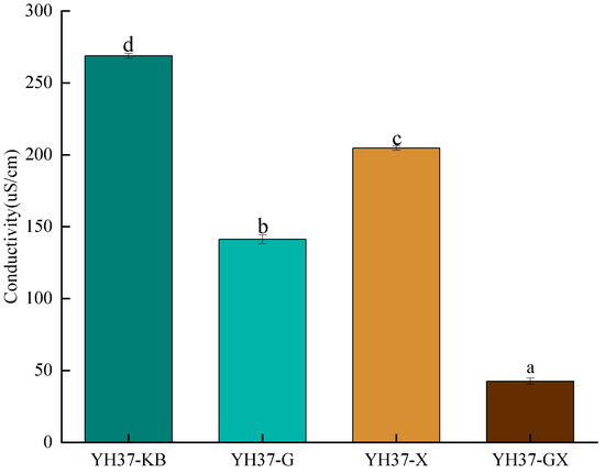The effect of distinct fatty acid additions on the conductivity of the emulsion is illustrated in Figure 5. The conductivity of an emulsion can be used to ascertain the specific type of emulsion present [37]. Zhao et al. [24] found that the conductivity of the emulsion began to decrease significantly with the increase in oleic acid addition, and the conductivity decreased from 114.5 μS/cm to less than 1 μS/cm, which was consistent with this result. When the conductivity is high, water acts as a continuous phase, and the emulsion exhibits the oil-in-water (O/W) type; when the conductivity of the emulsion is low, the oil is continuous, and the emulsion is the water-in-oil (W/O) type [38]. Compared to the initial peanut emulsion, the addition of fatty acids to the demulsified samples reduced conductivity considerably. The conductivity was found to decrease in the following order: YH37-GX < YH37-G < YH37-X < YH37-KB. The conductivity of the initial emulsion was 270.6 µS/cm and the emulsion was the O/W type. The conductivity of YH37-GX was significantly lower than that of YH37-KB, and the emulsion probably underwent a phase transition from O/W to W/O.
