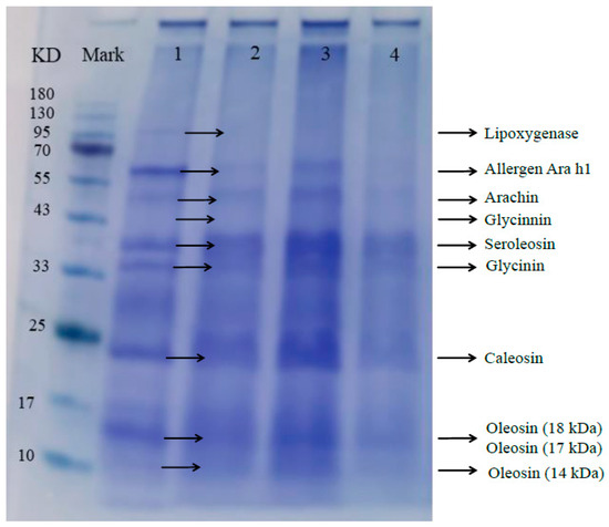 Three demulsification samples and a blank control were prepared following the methodology described in Section 2.6. The samples were subsequently lyophilized. The effects of adding different fatty acids on the protein composition of the peanut emulsions were evaluated by SDS-PAGE. The method used was slightly modified from that described by Zhao et al. [24]. Briefly, a protein sample mixture (4 mg/mL) was prepared by adding sample buffer (2 mL Tris-HCl (0.5 mol/L, pH 6.8); 1 mL mercaptoethanol; 2 mL 10 g/100 g SDS; 0.5 mL 0.5 g/100 g bromophenolblue; 2 mL glycerinum; and 2.5 mL distilled water), and the protein was denatured by boiling in a water bath for 5 min. A 5% separating gel and a 12% concentrating gel were sequentially run, and different samples were added to the lane. After electrophoresis, the gel was fixed, stained with a staining solution (Coomassie brilliant blue R250, Yeasen Co., Ltd., Shanghai, China) for 2 h, and destained until the protein bands were prominent. Finally, the gel was washed with deionized water and photographed for analysis.