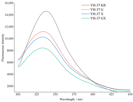 The samples prepared following the procedure outlined in Section 2.6 were weighed and combined with the prepared solution, which resulted in the formation of a solution that had a concentration of 0.5 mg/mL. Then, the endogenous fluorescence spectra of the samples were determined using a fluorescence spectrophotometer (FL970, Techcomp group, Co., Ltd. Shanghai, China). The parameters were set as follows: the excitation wavelength was 290 nm, the spectrum was scanned between 310 and 500 nm, and the excitation and emission slits were set at widths of 5 nm.