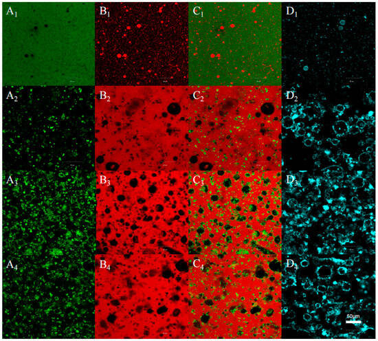 As illustrated in Figure 8, CLSM was performed to assess the alterations in the microstructure of the emulsion under the conditions of demulsification with the addition of different fatty acids. The oils, proteins, and phospholipids in the emulsion were stained with Nile red, FITC, and B-DHPE, respectively, which emitted red, green, and blue fluorescence under irradiation with different excitation wavelengths. The distributions of oil and protein in the system were largely similar to those in the initial emulsion, which served as a control. As shown in Figure 8C1, most of the oil droplets were spherical, with phospholipids forming rings distributed on the surfaces of the oil droplets. Meanwhile, proteins wrapped around the oils, resulting in the O/W emulsion due to the interaction of phospholipids and proteins. The addition of fatty acids resulted in the formation of several green aggregates and a substantial red area. This finding indicated that the interfacial membrane, which was formed by phospholipids and proteins, was disrupted, leading to the aggregation of the oil droplets. Decker et al. [45] showed that fatty acids could regulate the pH of the emulsion system, thereby destroying the interfacial membrane that was formed by phospholipids and proteins. After demulsification, red and blue rings formed in the system (Figure 8C,D). This indicated that the proteins were degraded and the products were dispersed in the aqueous phase and wrapped in the continuous oil phase, resulting in the formation of localized W/O structures. Moreover, the phospholipids formed rings that covered the surface of the oil.