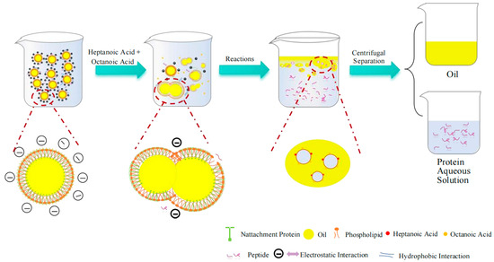 Based on these results, the mechanism for the effective demulsification of composite fatty acids was proposed, as illustrated in Figure 9. In the initial emulsion, phospholipids and proteins formed the interfacial membrane around the oil droplets. The emulsion was stable because there were more negative charges, and it exhibited the oil-in-water emulsion. Upon the addition of composite fatty acids to the emulsion, fatty acids interacted with phospholipids and the structures of proteins changed [44], the phospholipid-protein membrane was damaged. The proteins fragments were dispersed in the water phase. The addition of composite fatty acids could reduce the absolute potential, thereby weakening electrostatic interactions. This would lead to aggregation between oil droplets, forming larger-sized oil droplets, thus achieving demulsification.