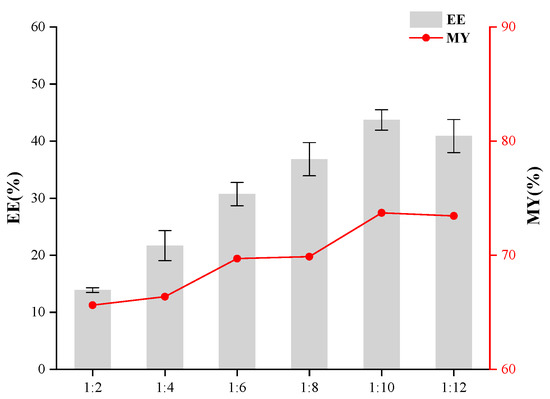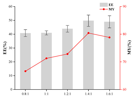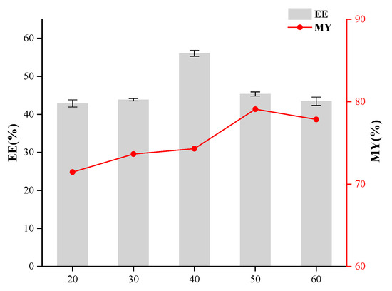 The microcapsule yield (MY), defined as the percentage of the total mass of encapsulated essence (M1) relative to the total initial mass of the core material (essence, M0) and wall material (β-CD, M2), was calculated as follows: