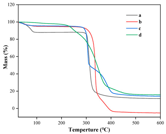 The TGA curves of β-CD (a), blank microcapsules (b), taro essence microcapsules, (c) and taro essence (d).