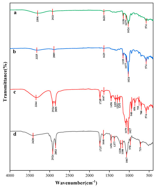 FTIR spectroscopy is commonly employed to characterize interactions between guest molecules and cyclodextrins [55]. As depicted in Figure 8, the infrared spectra of β-CD, blank microcapsules, and microcapsules encapsulating taro essence were presented. The spectra of β-CD and blank microcapsules were essentially consistent, as shown in Figure 8a and Figure 8b, respectively. The FTIR spectrum aligned well with those reported in the literature for β-CD molecules [56], featuring peaks at 3306 cm−1, 2921 cm−1, 1631 cm−1, and 1024 cm−1, which were attributed to the symmetric stretching vibration of -OH groups, C-H stretching vibrations, H-O-H bending vibrations, and asymmetric C-O-C stretching vibrations, respectively, within the β-CD molecule. Subsequent volatile component analysis revealed the presence of alcohols, aldehydes, alkanes, and alkenes among the organic constituents of taro essence. In Figure 8d, a broad peak at 3420 cm−1 corresponded to the stretching vibration of -OH groups in the taro essence components, while peaks at 2924 cm−1 and 2853 cm−1 were indicative of alkyl C-H stretching vibrations. Furthermore, peaks at 1737 cm−1 and 1646 cm−1 were associated with the stretching vibrations of carbonyl C=O and olefinic C=C bonds, respectively, present in the essence. In contrast, Figure 8c revealed that, compared with the blank microcapsules, the microcapsules encapsulating taro essence exhibited characteristic peaks at 2924 cm−1, 2855 cm−1, 1735 cm−1, and 1647 cm−1, which were attributed to the taro essence components. This observation signified the successful encapsulation of taro essence within the microcapsules. Notably, the strongest and most rounded peak observed at 3344 cm−1 suggested the presence of intermolecular hydrogen bonding [57], implying a robust intermolecular interaction between the taro essence and β-CD. This robust interaction, coupled with their excellent biocompatibility, facilitated the effective inclusion of taro essence within the β-CD matrix.