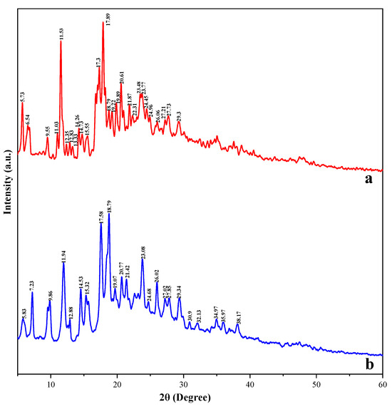 XRD has proven to be an invaluable tool in elucidating the formation of inclusion complexes, as evidenced by changes in crystallographic reflection peaks across various sample spectra, indicative of such complexation [61]. Figure 10 shows the XRD patterns of both blank microcapsules and taro flavor essence microcapsules, displaying intricate spectral line characteristics within their crystalline frameworks. The XRD pattern for the blank microcapsules revealed distinct and sharp characteristic peaks at 2θ diffraction angles of 5.73°, 11.53°, 17.3°, 17.89°, and 20.61°; minor peaks were identified at 9.55°, 14.26°, 19.89°, 21.87°, and 29.3°. In contrast, the XRD pattern of the taro flavor essence microcapsules exhibited a reduction in intensity and slight deviations in the positions of the characteristic peaks originating from the blank microcapsules, particularly at 5.83°, 11.53°, 17.89°, and 20.61°. Notably, the appearance of novel characteristic peaks at 7.23°, 17.58°, and 23.08° signifies the integration of new components. The XRD analysis conclusively confirmed that during the microencapsulation process, the taro flavor was successfully entrapped within the cavities of β-CD, leading to the formation of stable complexes.