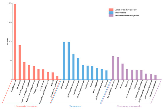 Microencapsulation holds a pivotal position in safeguarding and stabilizing volatile components, such as essence and fragrances, which are indispensable across diverse industries encompassing food, pharmaceuticals, and cosmetics [8,62]. This encapsulation methodology bolsters the stability and controlled liberation of volatile compounds, thereby prolonging their shelf life and safeguarding their sensory attributes [63]. Consequently, analyzing taro flavor is imperative for assessing the efficacy of micro-encapsulation techniques and refining production methodologies to enhance the delivery and sensory impact of volatile components in end products. HS-SPME-GCMS analysis identified and quantified volatile components in taro essence microcapsules, with detailed composition and quantities listed in Supplementary Table S1. The analysis of taro flavor essence revealed the presence of 69 volatile compounds, including 37 alkanes, 11 alcohols, 6 aldehydes, 5 esters, 4 alkenes, 3 ketones, 2 phenols, and 1 ether. Microencapsulated taro essence retained 31 volatiles, with 20 alkanes remaining predominant, followed by aldehydes (4), alcohols (3), esters (2), alkenes (1), and ketones (1). Notably, key flavor-associated alkanes, including hexadecane, pentadecane, and 2,6,11-trimethyl dodecane, were successfully encapsulated (Figure 11), suggesting that cyclodextrin-based microencapsulation stabilized hydrophobic compounds during processing.