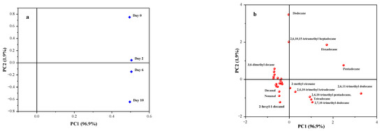 Principal component scores (a) and loading plot (b) of taro essence microcapsules during the storage.