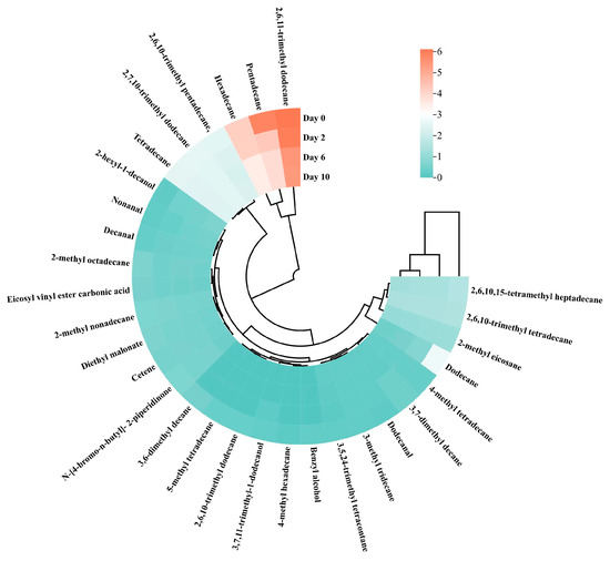 Principal Component Analysis (PCA) is a potent statistical approach for dimensionality reduction and the insightful exploration of extensive datasets [64]. It adeptly uncovered latent patterns and correlations within the data, as evidenced in the analysis of volatile compounds during microcapsule storage. The PCA score plot in Figure 12 revealed the distribution of PC1 and PC2 across distinct quadrants, highlighting commonalities and contrasting differences in the flavor substances volatilized at various stages. The volatile components remained in the same quadrant on day 2 as observed on day 0. However, by day 6, the components had shifted to the fourth quadrant, reflecting a discernible alteration. This shift became more pronounced after 10 days of storage, demonstrating a significant divergence from the initial state. The distance of sample data points from the center in the load map directly correlates with the importance of the corresponding substances, with farther points indicating higher significance, and specific compounds demonstrating strong correlations in different principal components [65,66]. The loading plot showed that most substances were concentrated towards the center of the plot, with notable exceptions including dodecane, 2,6,10,15-tetramethyl heptadecane, hexadecane, pentadecane, and 2,6,11-trimethyl dodecane. Notably, 2,6,11-trimethyl dodecane and pentadecane exhibited a strong positive correlation with PC1; dodecane, 2,6,10,15-tetraethyl heptadecane showed a high positive correlation in PC2; while hexadecane showed a significant positive correlation in PC1 and PC2, indicating their abundance and high importance during this period. This analysis aided in visualizing the variable relationships between flavor components and samples, providing insights into the temporal changes and significance of volatile compounds during storage.