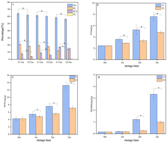 Figure 1B illustrates the changes in the AV of C. saira at various storage temperatures, revealing a gradual increase in AV with the extension of the storage period. Notably, the AV in the T1 group increased significantly more than in the T2 group (p < 0.05). This observation aligned with the results from the lipid composition analysis, suggesting a potential link to the hydrolysis of TC and PL. Furthermore, the rate of lipid hydrolysis was influenced by several factors, including the moisture content and its state within the samples, as well as the activity of endogenous lipase and other variables [22,23]. POV was an index used to determine the content of primary oxidation products, such as hydroperoxides, which can reflect the degree of the primary oxidation of lipids [24]. Aquatic products, such as C. saira, are rich in unsaturated fatty acids, which were prone to oxidative decomposition during storage, leading to the formation of malondialdehyde. The TBARS assay was utilized to evaluate lipid secondary oxidation by measuring the malondialdehyde content produced during this process [25]. Lipid oxidation was generally unavoidable during transportation or storage, resulting in significant increases in both POV and TBARS values in C. saira. Figure 1C,D illustrate the changes in POV and TBARSs, respectively, at different storage temperatures. The POV and TBARS values of the T1 group increased significantly compared to the T2 group (p < 0.05).