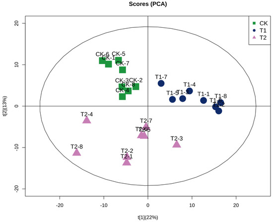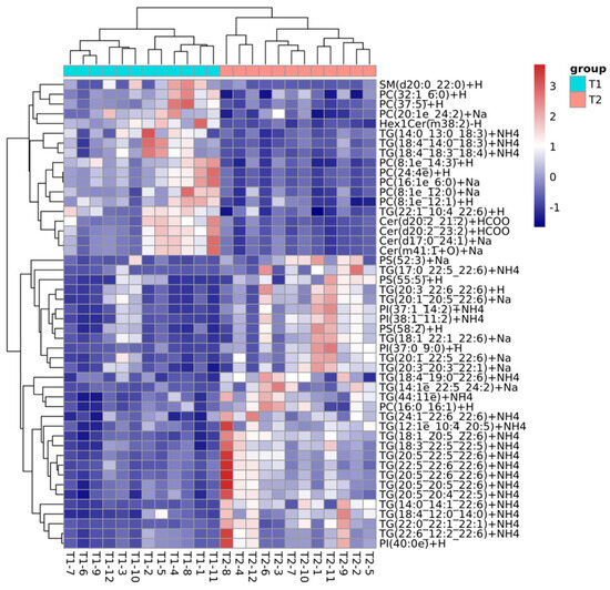 In order to elucidate the changes in the lipid profile of C. saira under different storage temperatures and identify potential differences in lipid types, a principal component analysis (PCA) model was established, as illustrated in Figure 2. The figure demonstrated the distribution of the lipid profiles in the three groups of C. saira, from which it could be seen that the distribution of the same group of C. saira was concentrated in a region. The samples of TI and T2 groups were dispersed in different regions and far away from each other, which indicated that there were significant differences in the lipid profiles of the T1 and T2 group of C. saira, and further confirmed that storage temperature has a substantial effect on the lipid profiles of C. saira.