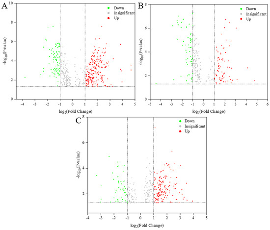 Volcano plot of differential lipid molecules in CK versus T1 sample (A), CK versus T2 sample (B), T1 versus T2 sample (C).