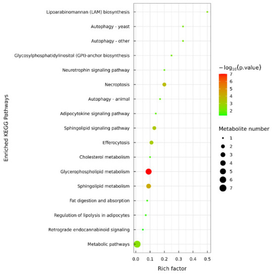 The analysis of metabolic pathways provided insights into how frozen storage temperatures affect lipid distribution in samples, as indicated in previous studies [6]. Utilizing the KEGG database, the pathway annotation analysis of lipid differential metabolites in C. saira at varying storage temperatures was depicted in Figure 5. Comparative analysis revealed that these differential metabolites were predominantly enriched in 17 metabolic pathways of the T1 (−18 °C) vs. T2 (−25 °C) group. Among these, glycerophospholipid metabolism emerged as the primary pathway enriched during the frozen storage process. Key lipid components such as phosphatidylcholine (PC), phosphatidylethanolamine (PE), phosphatidylinositol (PI), and phosphatidylserine (PS) were annotated within this pathway. These lipids were crucial as they constitute major components of cell membranes, thereby maintaining cellular physiological functions and facilitating the transport of triglycerides [34]. Additionally, sphingolipid metabolism was identified as another significant pathway enriched during frozen storage, with ceramide (Cer) and sphingomyelin (SM) being the two significantly different lipid metabolites annotated in this pathway. Further investigation into the lipid oxidation pathway is necessary, in conjunction with metabolomics, to uncover the potential key lipid molecules involved in the storage process of C. saira.