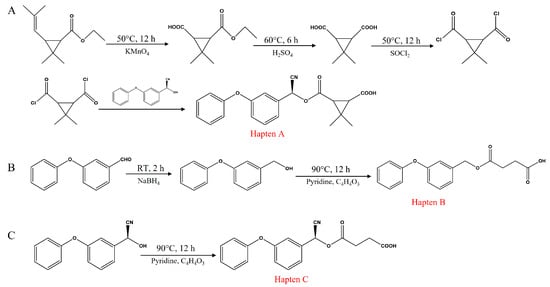 Three haptens, namely hapten A, hapten B, and hapten C, were synthesized, with the synthetic routes illustrated in Figure 1. Haptens A, B, and C were synthesized and identified by IT-TOF-MS (Shimadzu Corporation, Kyoto, Japan). The mass spectrometer was operated in positive ion mode with a scan range of m/z 100–1000. The sample was dissolved in 1 mL of methanol, separated by chromatography, and then injected. The spectra were obtained by scanning in positive/negative ion mode using an ESI source. The detailed procedures for hapten synthesis are outlined as follows.