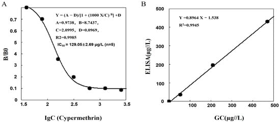 The standard inhibition curve of cypermethrin measured by heterologous ic-ELISA (A). The correlation of the cypermethrin assay between the ic-ELISA and the GC method for the incurred water samples (B).