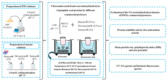 Subsequently, PSPs were subjected to a US-assisted enzymatic hydrolysis, and the peptides obtained were evaluated for macrostructural characteristics, solubility, and in vitro antioxidant activity (Figure 1).