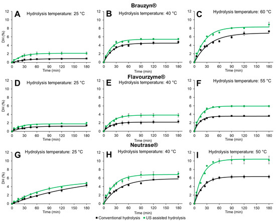 Conventional and ultrasound-assisted hydrolysis of the pumpkin seed protein (PSP) using Brauzyn® (A–C), Flavourzyme® (D–F), and Neutrase® (G–I) at different temperatures. The dots are the experimental values, the vertical bars are the standard deviation for each condition, and the curves (continuous lines) are the adjusted model of Equation (2). DH = Degree of hydrolysis (%).