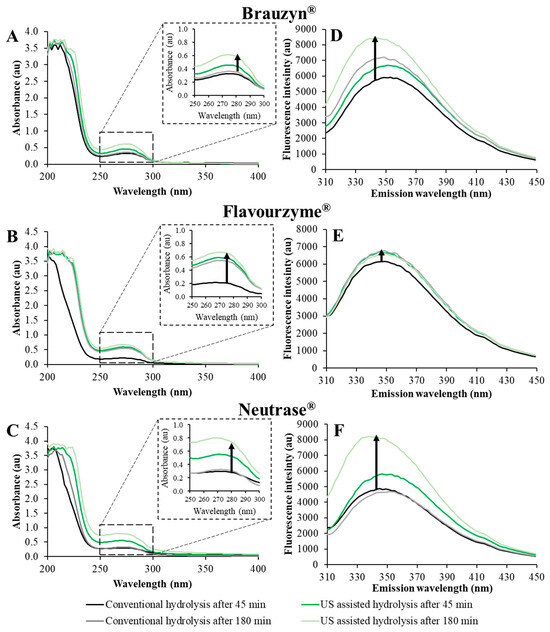 UV–Vis spectra (A–C) and Intrinsic fluorescence spectra (D–F) at pH 7.5 for protein hydrolysates obtained after 45 and 180 min of conventional and ultrasound-assisted hydrolysis.