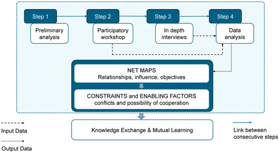The applied Net-Map methodology is based on recent adaptations developed and tested by Pilamala Rosales et al. [17] and van der Linden et al. [16]. Before conducting the actual Net-Map analysis, as recommended by Schiffer (2007) [13], some background information on stakeholders’ categories and goals, here called preliminary analysis, were collected.